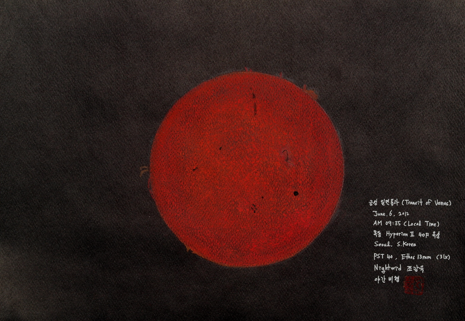 Eclipse, Inner Planets, Sun Transit of Venus 2012 SAMSUNG CSC Date: 6 June 2012Author: Nightwid 0 Comments Media : Black Paper, Pastel Pencils SAMSUNG CSC Share this: Share on Facebook (Opens in new window) Facebook Like Loading... Related