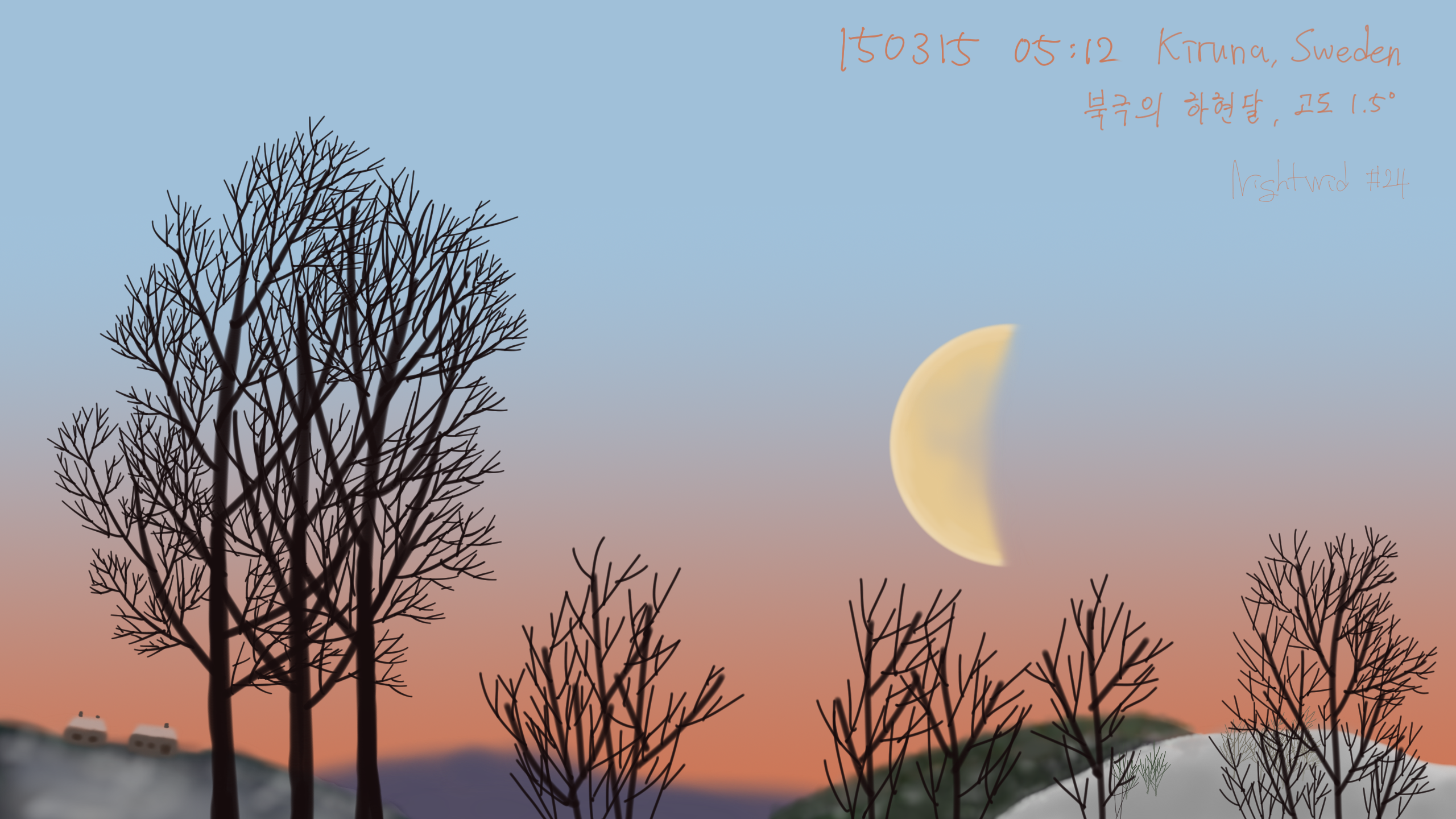 Moon Scenery, Moons of Seoul Day 24 Third Quarter Moon in Arctic Date: 15 March 2015Author: Nightwid 0 Comments Media : Galaxy Note 4, Stylus Pen Kiruna, Sweden Nightwid Share this: Click to share on Facebook (Opens in new window) Facebook Like Loading... Related