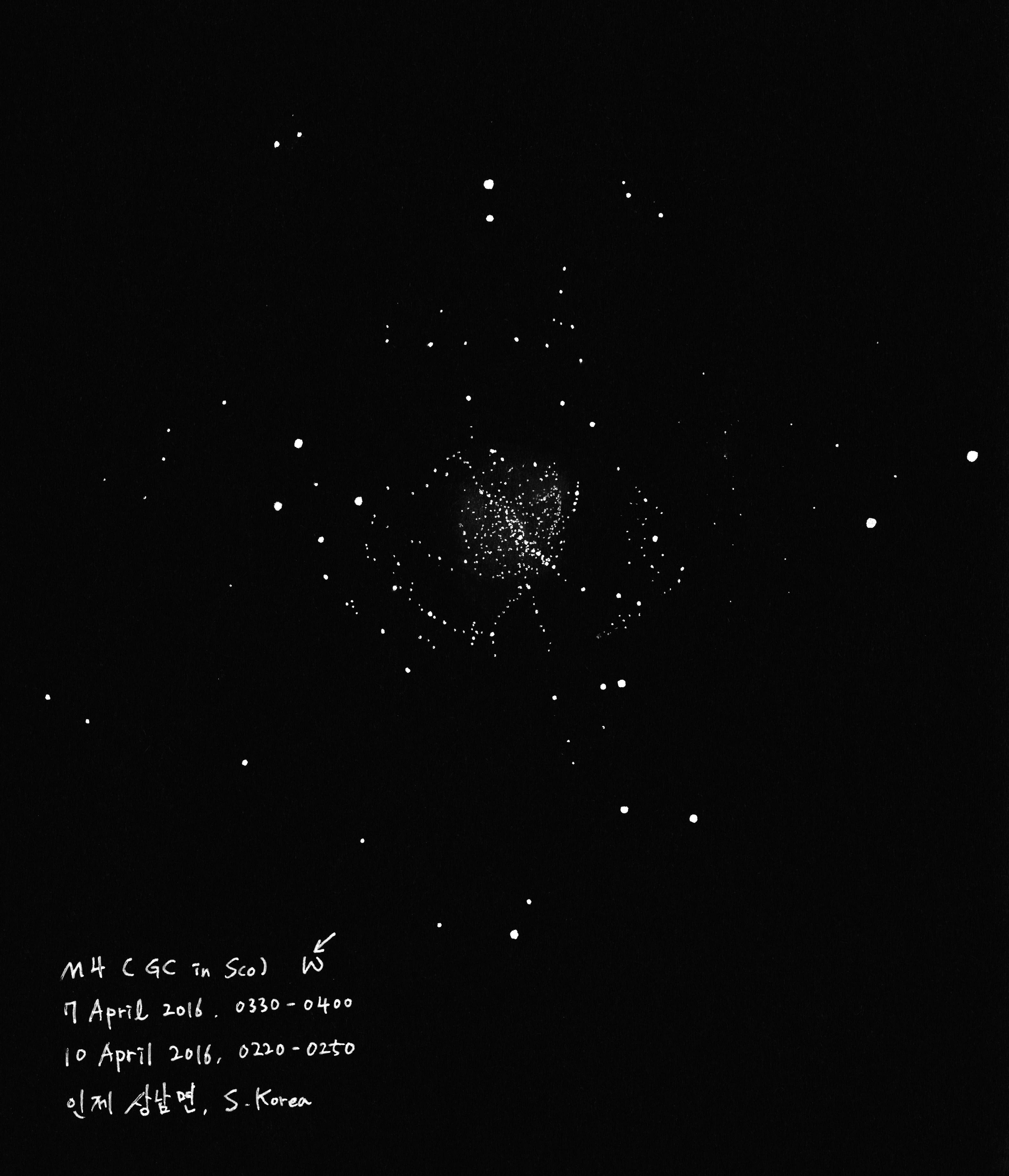 Messier M4 Date: 5 July 2016Author: Nightwid 0 Comments Media : Black Paper, White Gel Pen, Pastel Pencil Share this: Click to share on Facebook (Opens in new window) Facebook Like Loading... Related