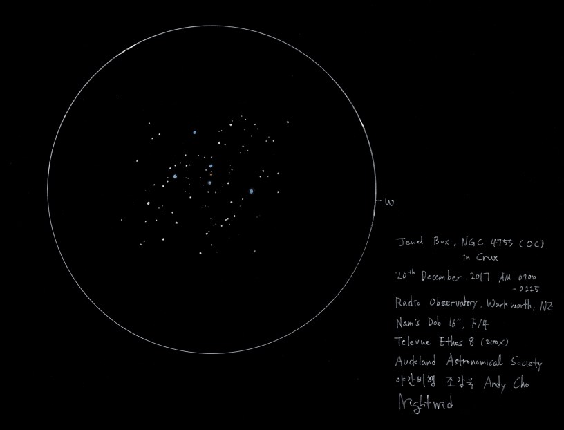 NGC NGC 4755 (Jewel Box, 2nd try) Date: 20 December 2017Author: Nightwid 0 Comments Media : Black Paper, White Gel Pen, Pastel Pencils Share this: Click to share on Facebook (Opens in new window) Facebook Like Loading... Related