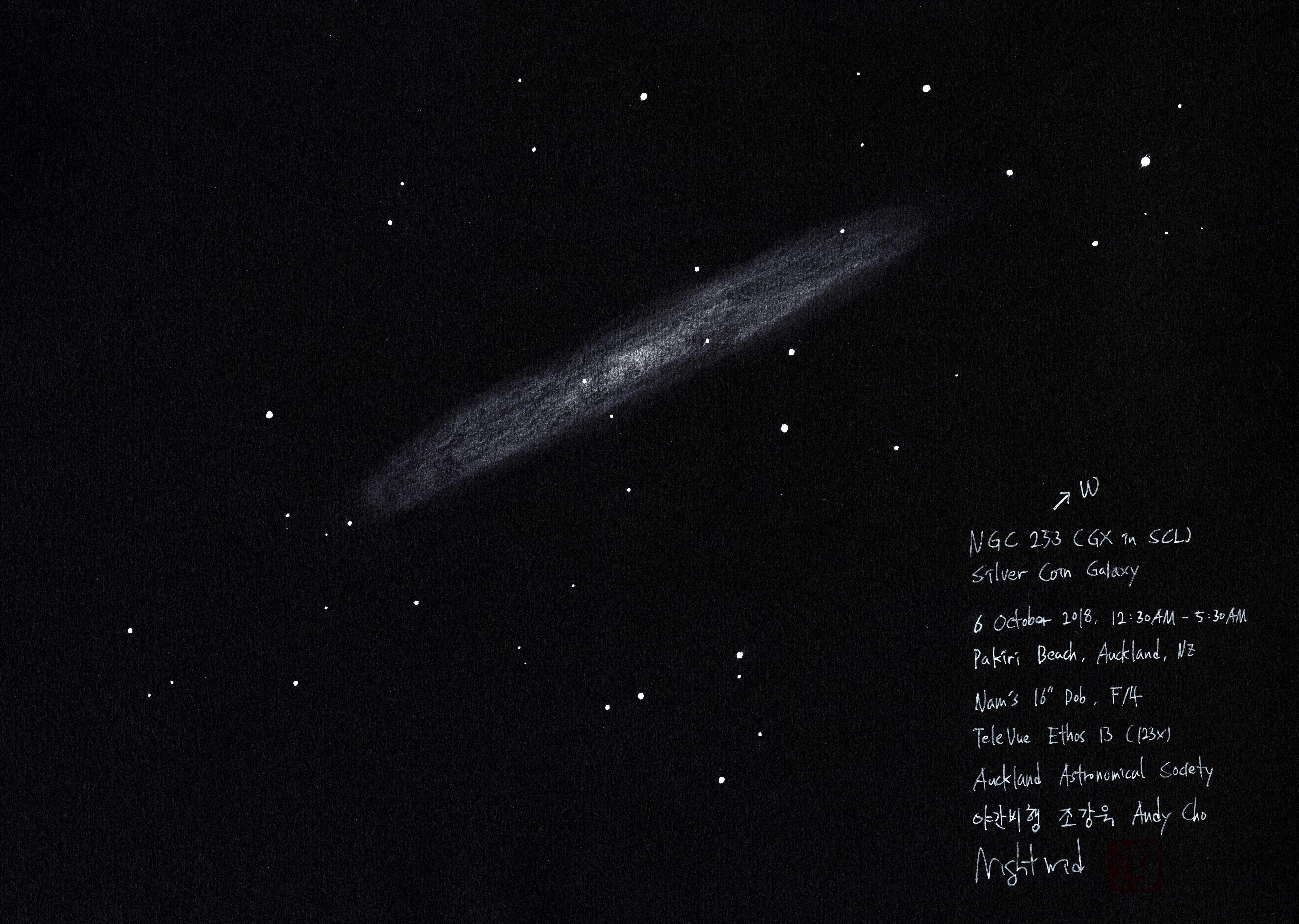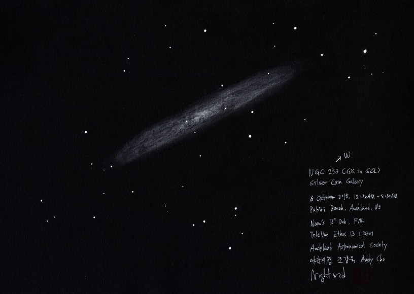 NGC NGC 253 (Silver Coin Galaxy) Date: 6 October 2018Author: Nightwid 0 Comments Media : Black Paper, White Gel Pen, Pastel Pencil Share this: Click to share on Facebook (Opens in new window) Facebook Like Loading... Related