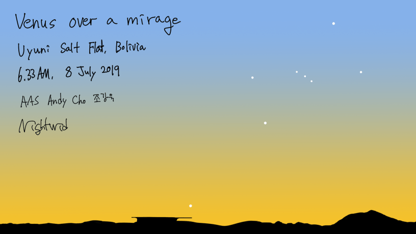 Inner Planets, The Sky Venus over a mirage – Uyuni, Bolivia Date: 8 July 2019Author: Nightwid 0 Comments Media : Galaxy Note 8, Stylus Pen Share this: Click to share on Facebook (Opens in new window) Facebook Like Loading... Related
