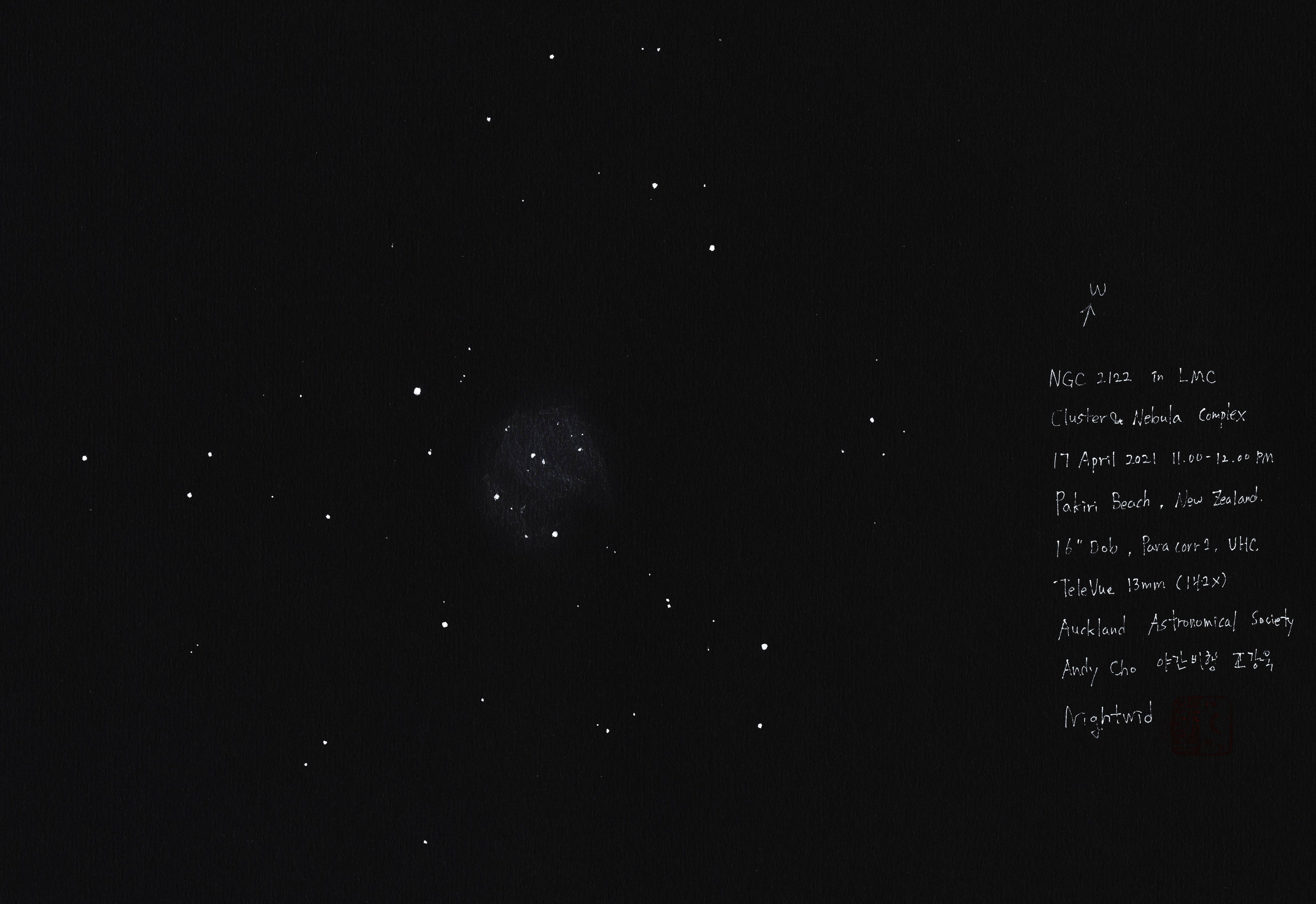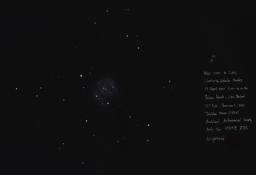 LMC #17 NGC 2122 Region | Cluster & Nebula Complex Date: 17 April 2021Author: Nightwid 0 Comments Media : Black Paper, Rotring Isograph, Pastel Pencil Share this: Click to share on Facebook (Opens in new window) Facebook Like Loading... Related