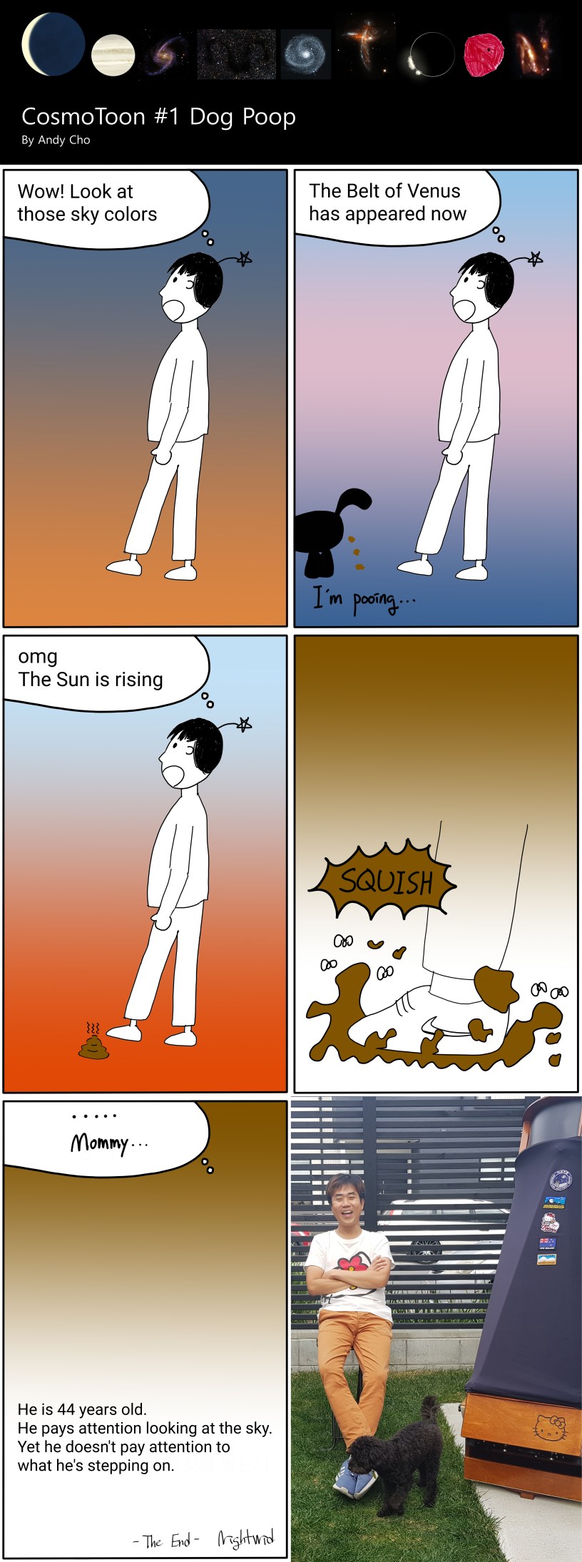 CosmoToon CosmoToon #1 – Dog Poop Date: 17 July 2022Author: Nightwid 0 Comments Webtoons for stargazers by digital drawing – Andy Cho [ English version ] [ Korean version ] Share this: Click to share on Facebook (Opens in new window) Facebook Like Loading... Related