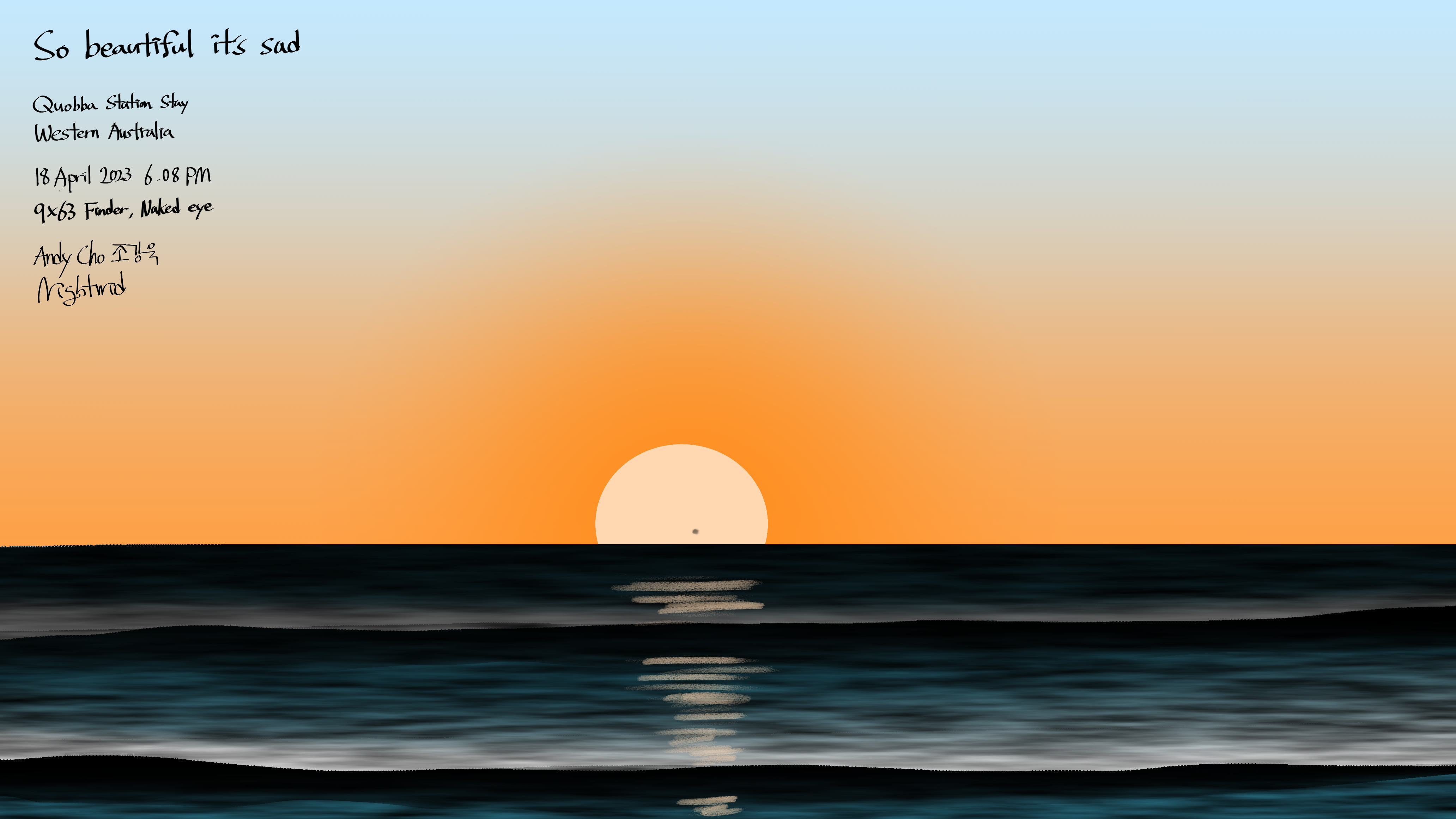 The Sky So beautiful it’s sad (GIF Animation) Date: 18 April 2023Author: Nightwid 0 Comments Media: Samsung Galaxy Tab S7+, Naked eyes & 9*63 Finder I searched for the “Green Flash,” but I couldn’t find it. It’s a pretty beautiful sunset.. so I felt sad lol.You can find 2 sunspots too. Share this: Click to share on Facebook (Opens in new window) Facebook Like Loading... Related