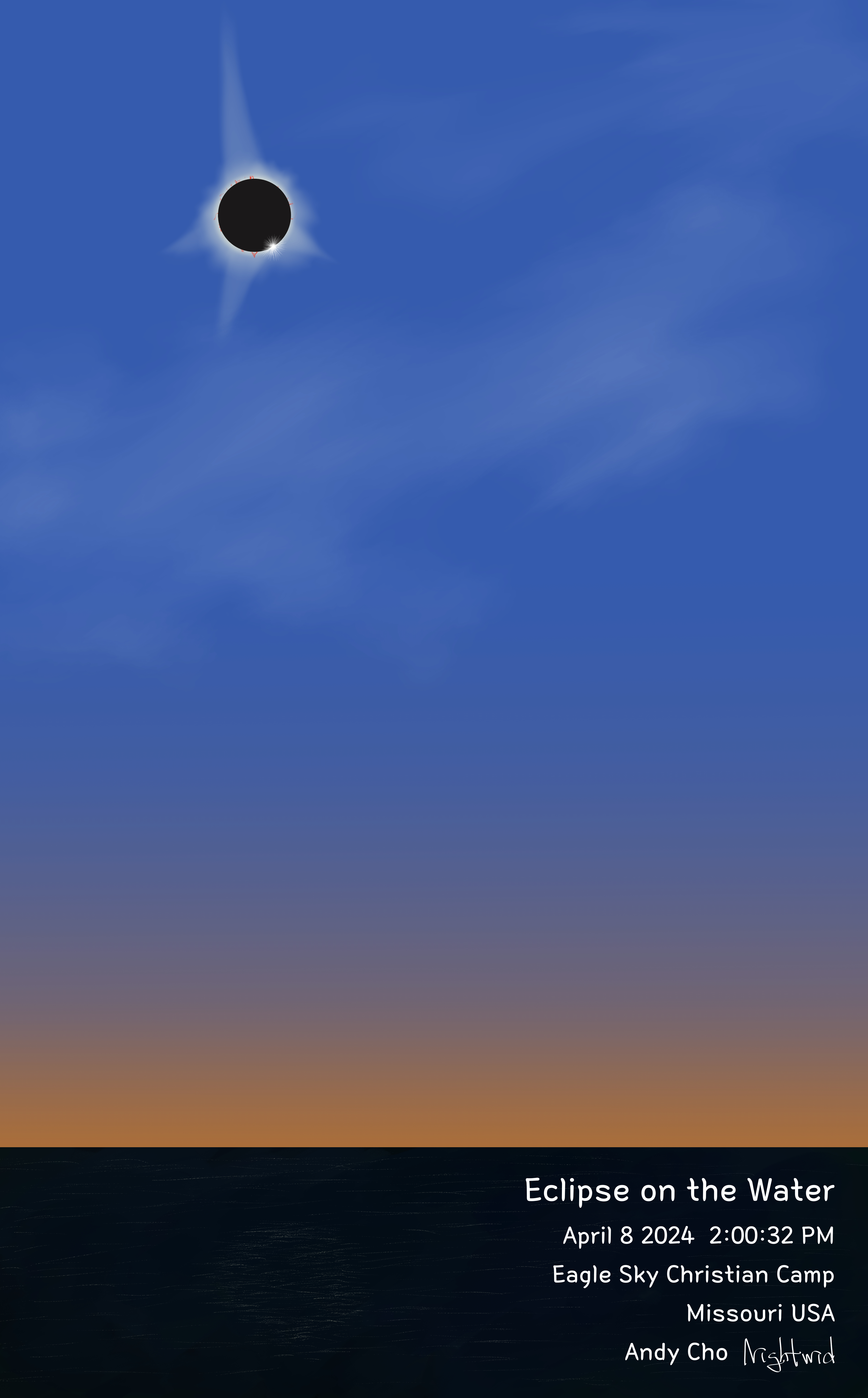 Eclipse 2024 Total Solar Eclipse – A naked eyes drawing Date: 8 April 2024Author: Nightwid 0 Comments Media: Galaxy Tab S7+ & Stylus pen The Eclipse on the unbelievably peaceful lake at Eagle Sky Camp in Missouri. The combination of the naked eye drawing and the Solar scope drawing. (Below image) Share this: Click to share on Facebook (Opens in new window) Facebook Like Loading... Related