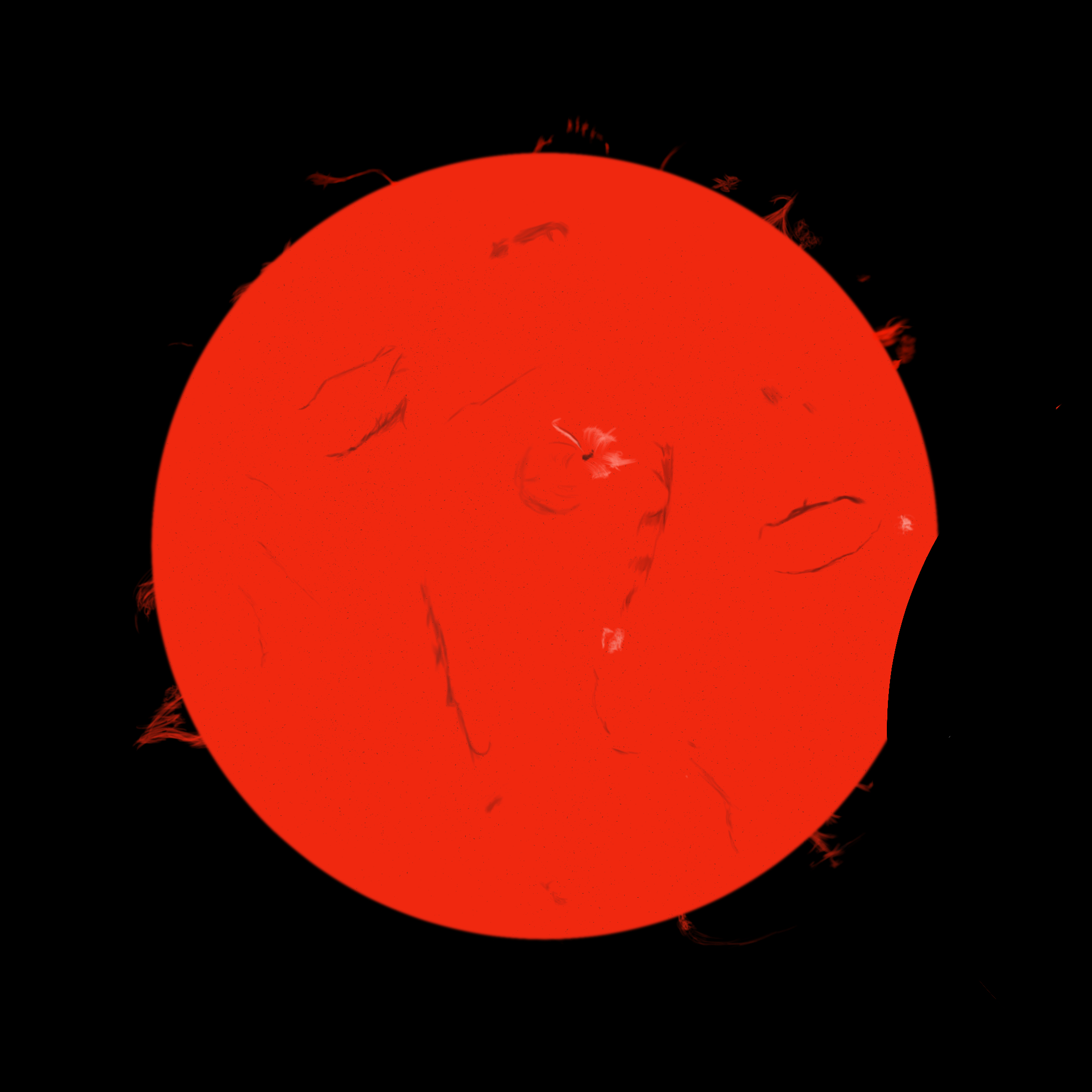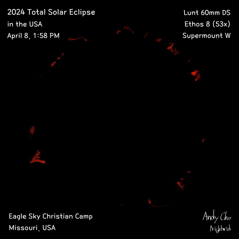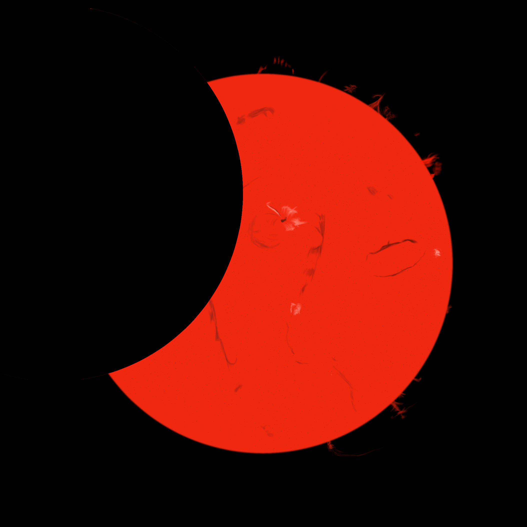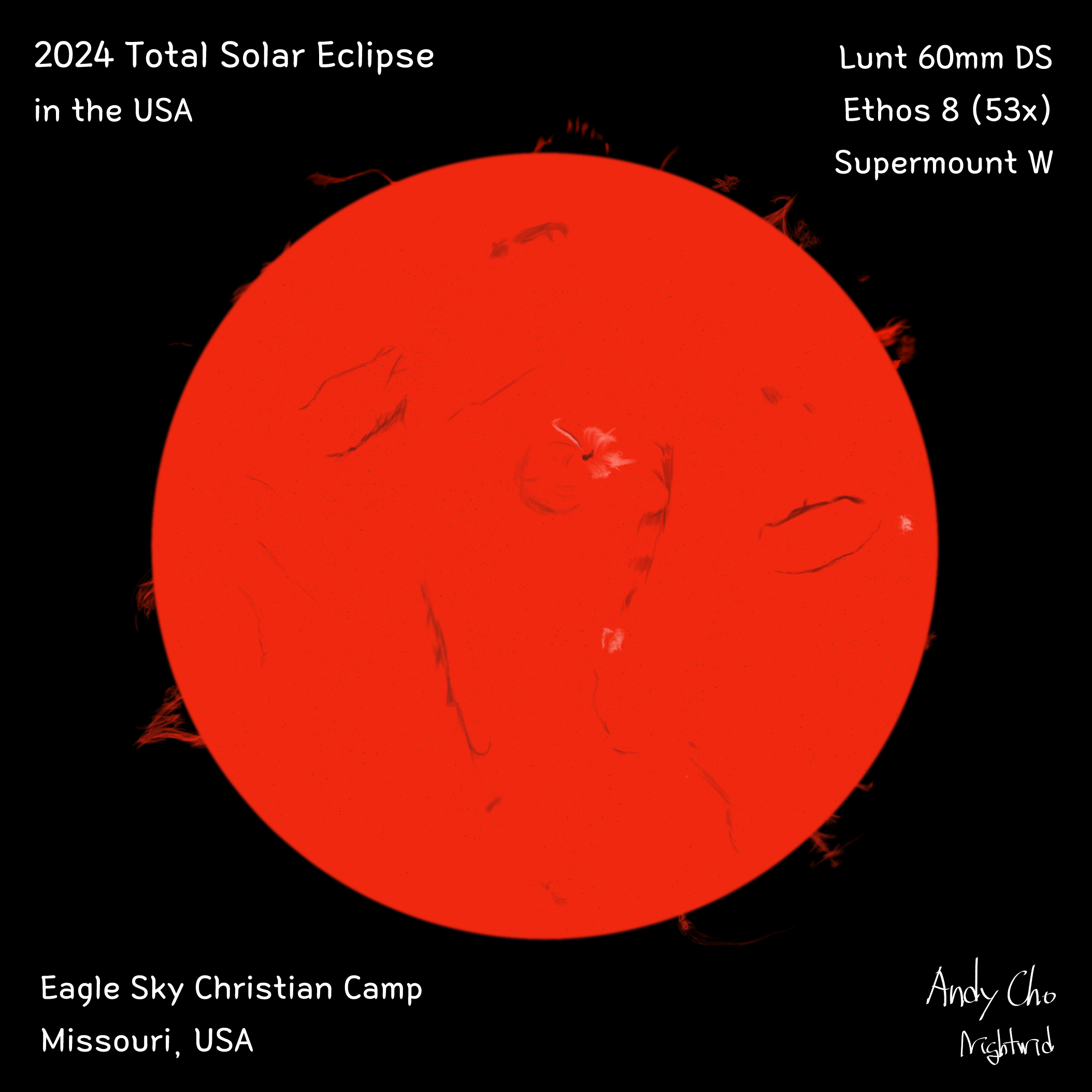 Eclipse 2024 Total Solar Eclipse – Solar Scope drawing Date: 8 April 2024Author: Nightwid 0 Comments Media: Lunt 60 Double Stack, Galaxy Tab S7+, Clip Studio Solar Scope drawing during the totality.The size of the prominences is the same as before the totality. The images below show the progress of the eclipse by solar scope. Share this: Click to share on Facebook (Opens in new window) Facebook Like Loading... Related