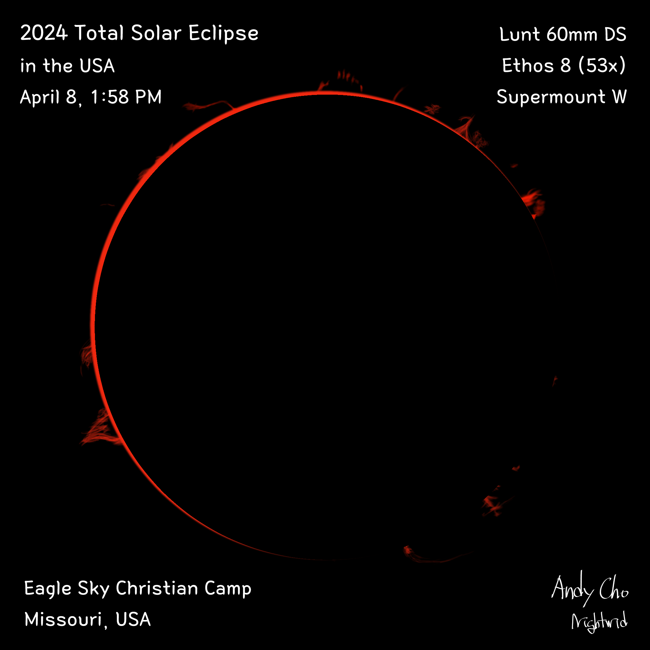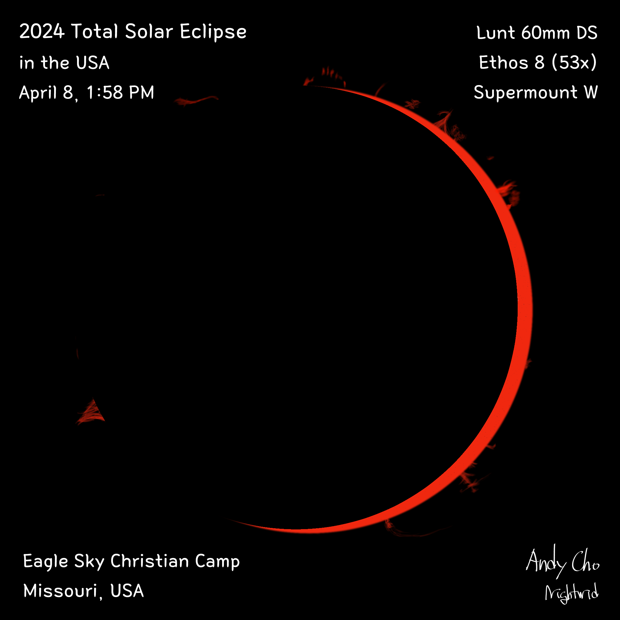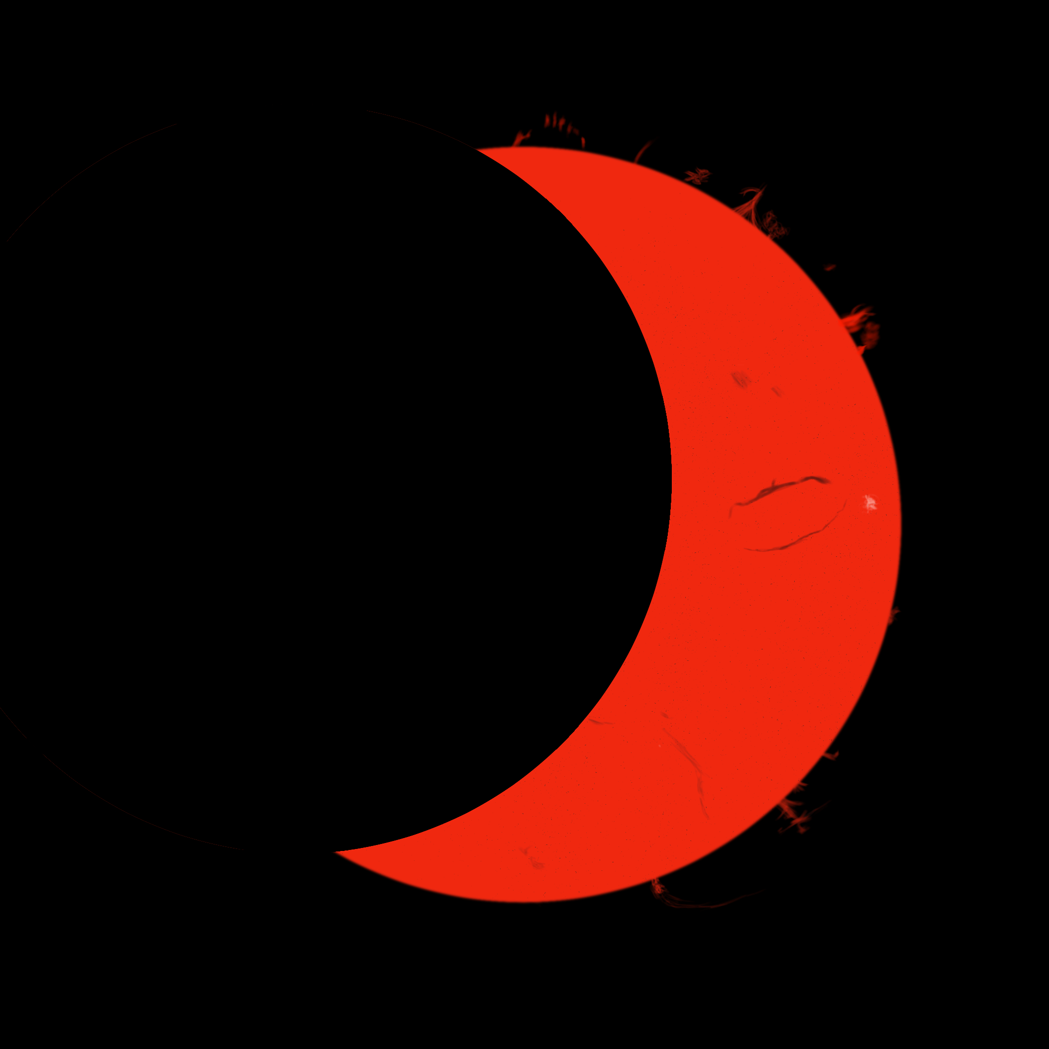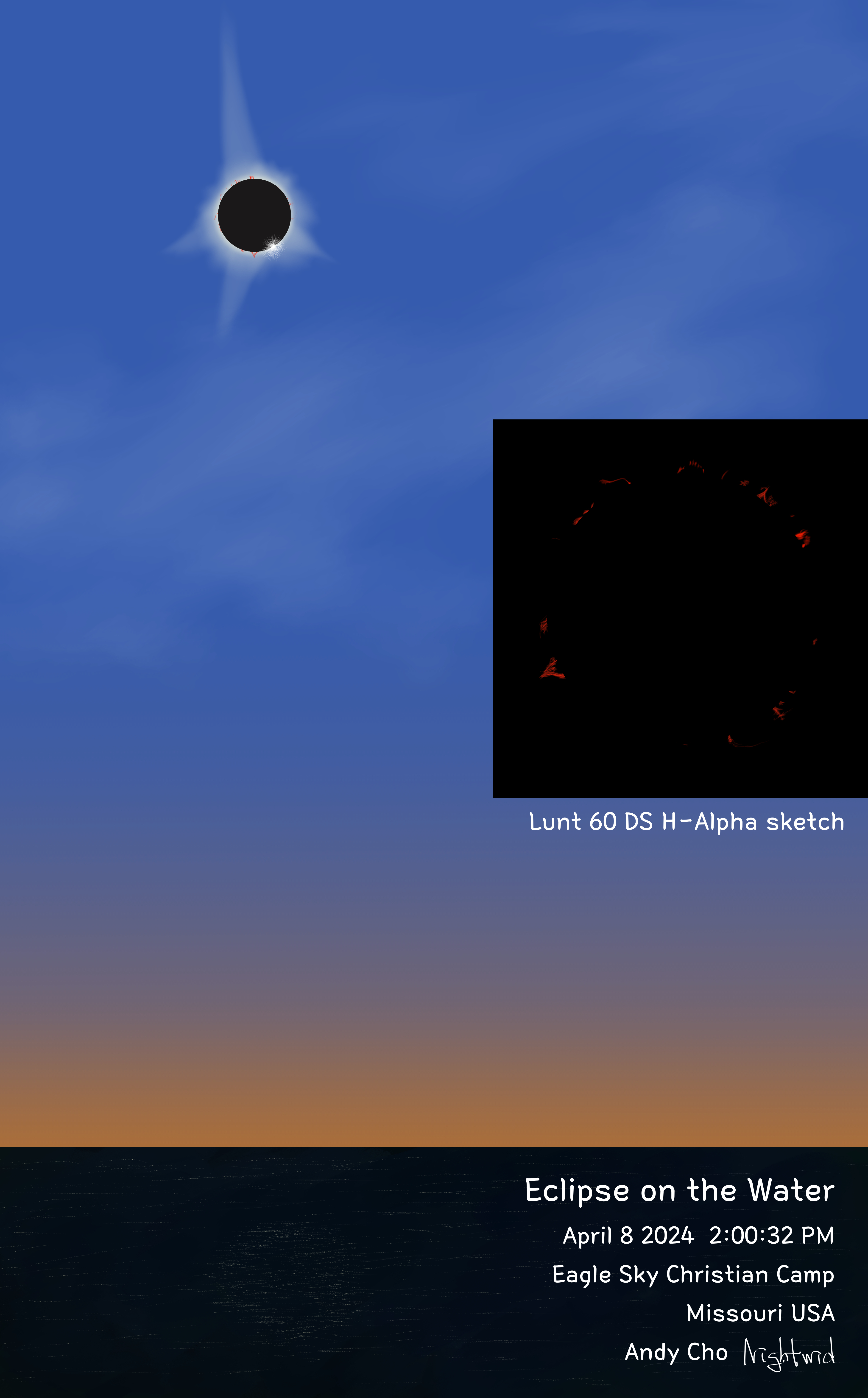Eclipse 2024 Total Solar Eclipse – Solar Scope drawing Date: 8 April 2024Author: Nightwid 0 Comments Media: Lunt 60 Double Stack, Galaxy Tab S7+, Clip Studio Solar Scope drawing during the totality.The size of the prominences is the same as before the totality. The images below show the progress of the eclipse by solar scope. Share this: Click to share on Facebook (Opens in new window) Facebook Like Loading... Related