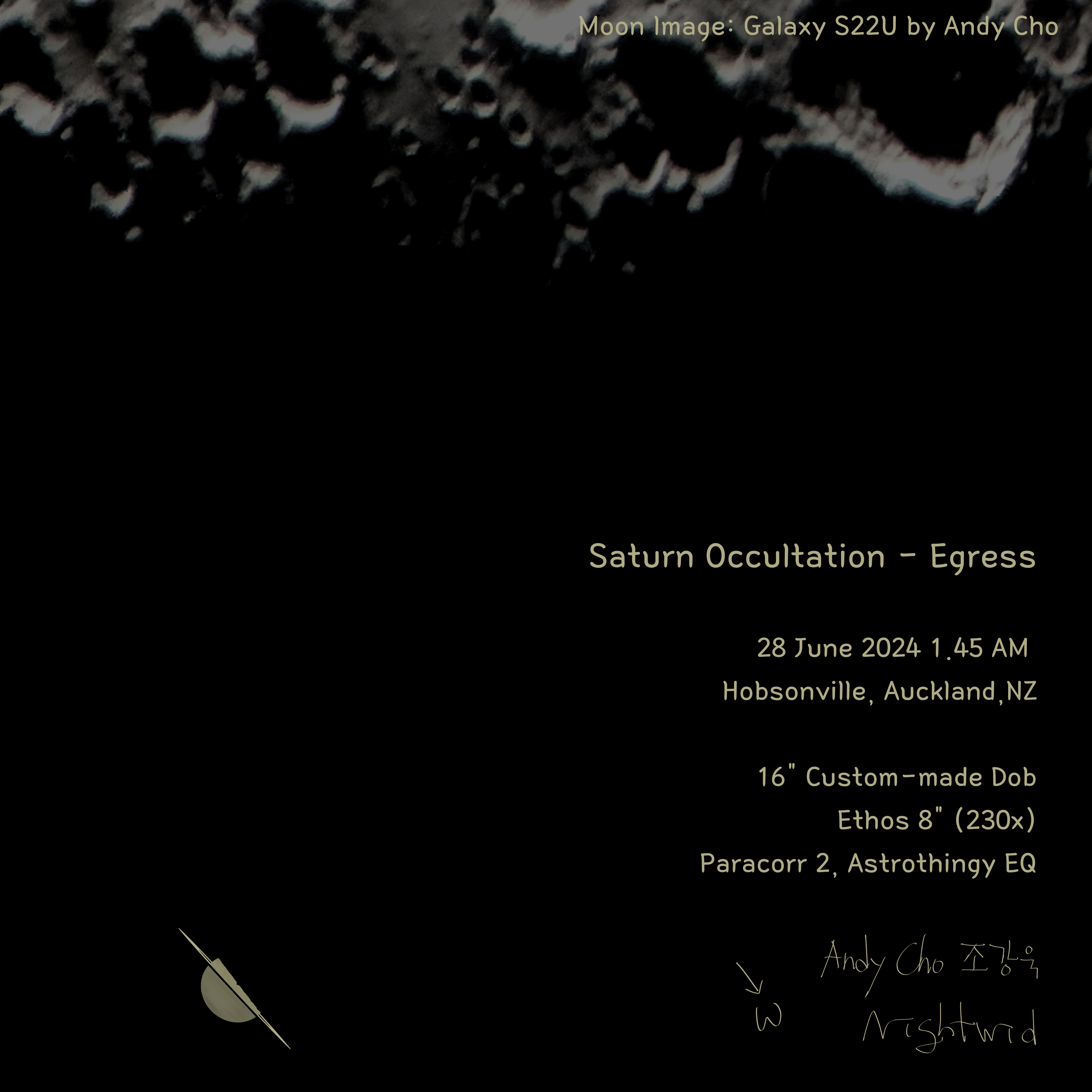 Lunar Events, Saturn June 2024 Saturn Occultation – Egress Date: 28 June 2024Author: Nightwid 0 Comments Media: Samsung Galaxy Tab S7+ (Drawing), Galaxy S22 Ultra (Moon photo) It’s a combined image with a drawing of the egress of the Saturn by tablet and a Moon photo by phone using my16″ dob. Fun task haha Share this: Share on Facebook (Opens in new window) Facebook Like Loading... Related