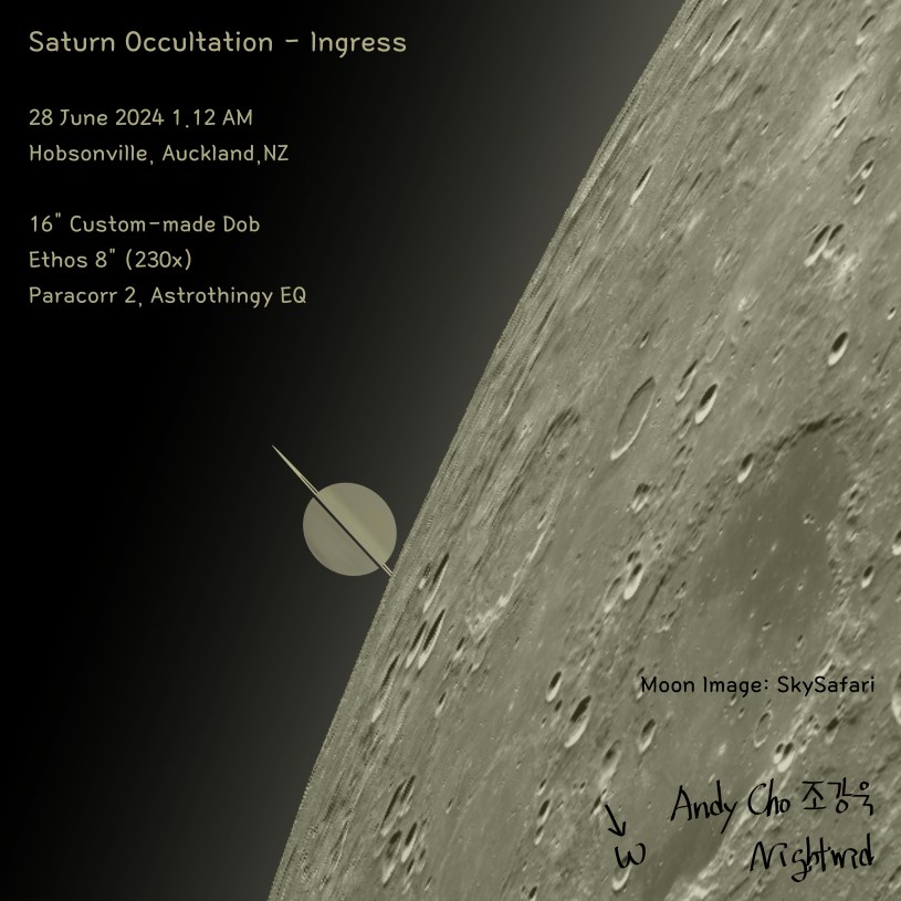 Lunar Events, Saturn June 2024 Saturn Occultation – Ingress Date: 28 June 2024Author: Nightwid 0 Comments Media: Samsung Galaxy Tab S7+ (Drawing) It’s a combined image with a drawing of the egress of the Saturn by tablet and 16″ dob and a screenshot of Sky Safari. Fun task haha Share this: Click to share on Facebook (Opens in new window) Facebook Like Loading... Related